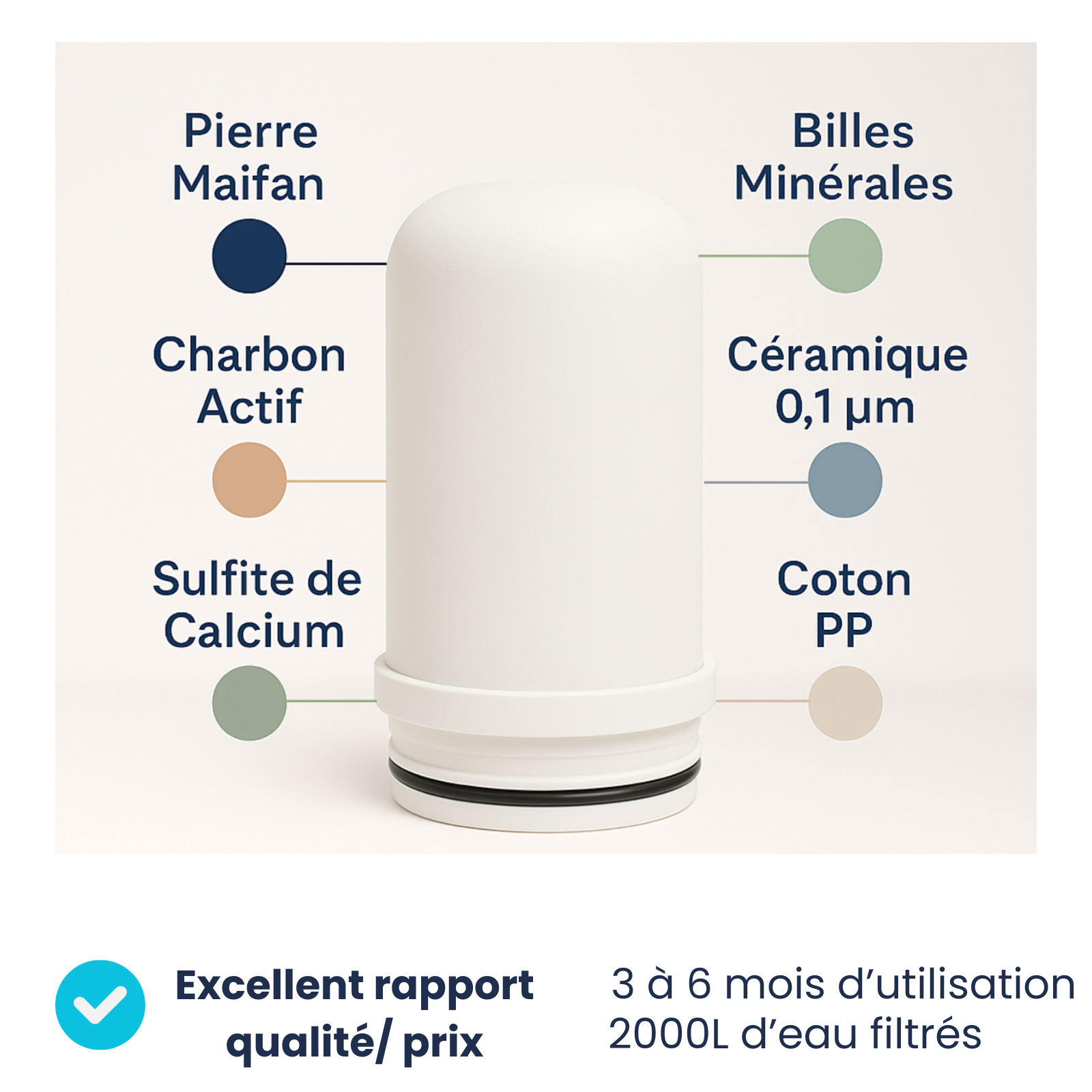 La cartouche filtrante n'est à changer que tous les 3 à 6 mois et filtre jusqu'à 2000L d'eau.