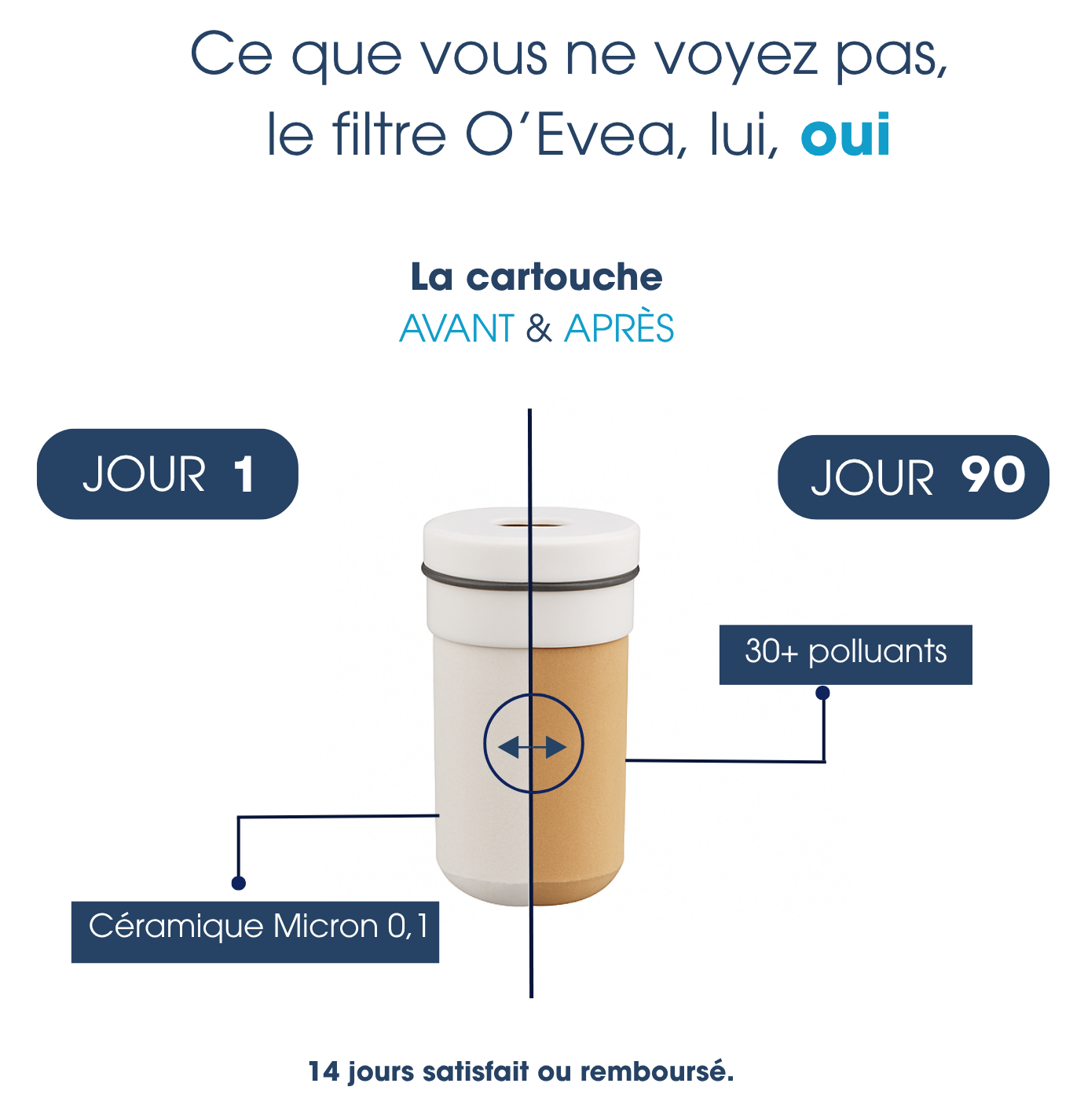 Conçu pour s'adapter à 99% des robinets, le filtre à eau O'Evea est efficace pour l'élimination de bactéries, virus, pesticides, médicaments et bien plus grâce à sa membrane céramique ultra-fine (0,1 micron).